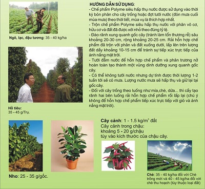 + Đối với cây trồng đang thu hoạch: xới đất cho tơi xốp, sâu 10cm ở gốc, bón polyme siêu hấp thụ nước, đảo đều với đất rồi tưới đẫm nước.