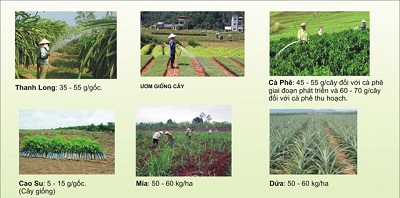 + Chè: 35 - 40 kg/ha đối với Chè trồng mới và 40 - 45 kg/ha đối với chè thu hoạch (tùy thuộc loại đất)